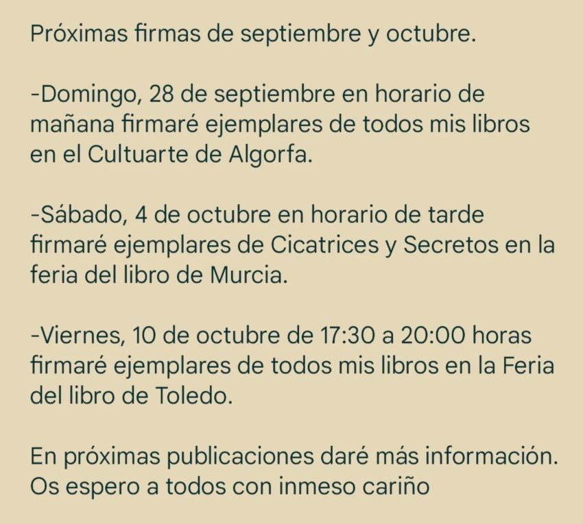 Nuestra Escritora Carmen Galvañ Bernabe anuncia nuevas fechas de presentaciones y firmas, donde estará proximamente como son las ciudades de Algofa, Murcia y Toledo. Donde ella estará encantada de recibir a sus lectores y todo aquel que quiera conocerla a ella y sus letras.
