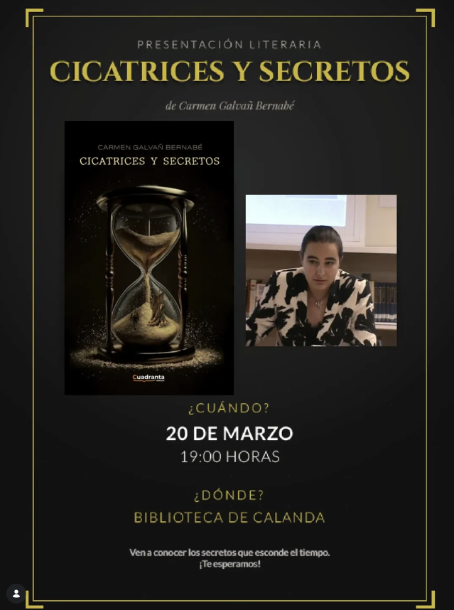 Presentación de Carmen Galvañ Bernabé de su último libro de relatos premiados «Cicatrices y Secretos», donde nos compartira y charlara con todos los asistentes y donde podrá responder a vuestras preguntas. Y además podrás llevarte el libro firmado por la autora.